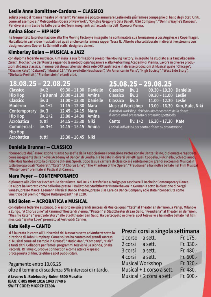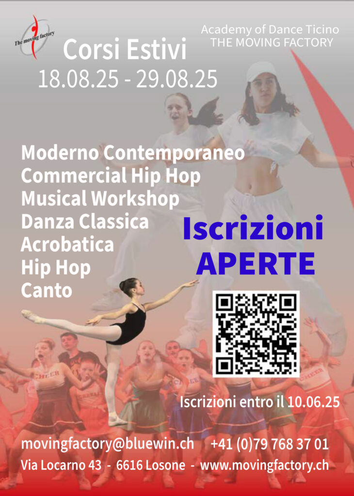 CORSI ESTIVI 2025 – Danza con Noi! Scopri il nostro entusiasmante programma estivo di danza! Informati e iscriviti ora inviando un’e-mail a movingfactory@bluewin.ch o visita nostro sito www.movingfactory.ch/it Non perdere l’occasione di ballare e stare in forma anche durante l’estate!